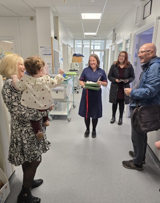 Ychydig wythnosau'n ddiweddarach, dychwelodd Bryan a Ray i'r uned gyda Daisy Ray a'i mam i drosglwyddo'r rhodd yn bersonol. Roedd yr ymweliad yn foment deimladwy i'r tîm newyddenedigol a oedd wedi cefnogi Daisy Ray trwy ei dyddiau cynnar.